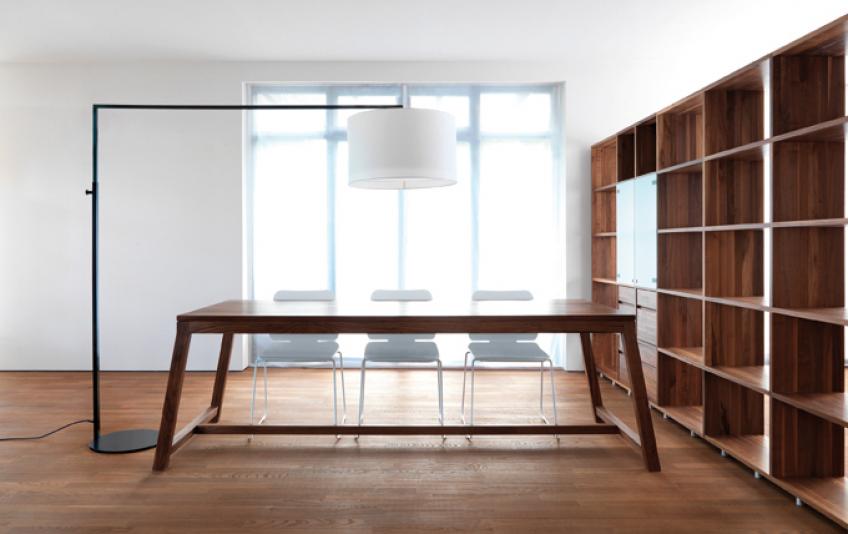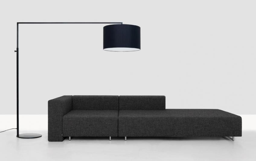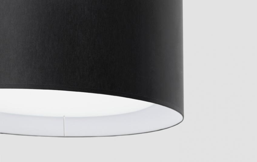 Stehleuchte HIGH NOON, Design EL SCHMIDT, Hersteller ZEITRAUM, Gestell Eisen mattschwarz pulverbeschichtet, Schirm Lamitex weiß, Textil weiß/warmgrau/ schwarz, incl. Dimmer